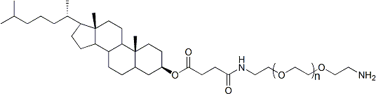 CLS-PEG-NH2(膽固醇聚乙二醇胺)是一種具有良好水溶性的親脂性脂質(zhì)PEG綴合物。PEG膽固醇衍生物可用于制備脂質(zhì)體以改善包封藥物的循環(huán)時間。它們也可用于非病毒轉(zhuǎn)染試劑。
