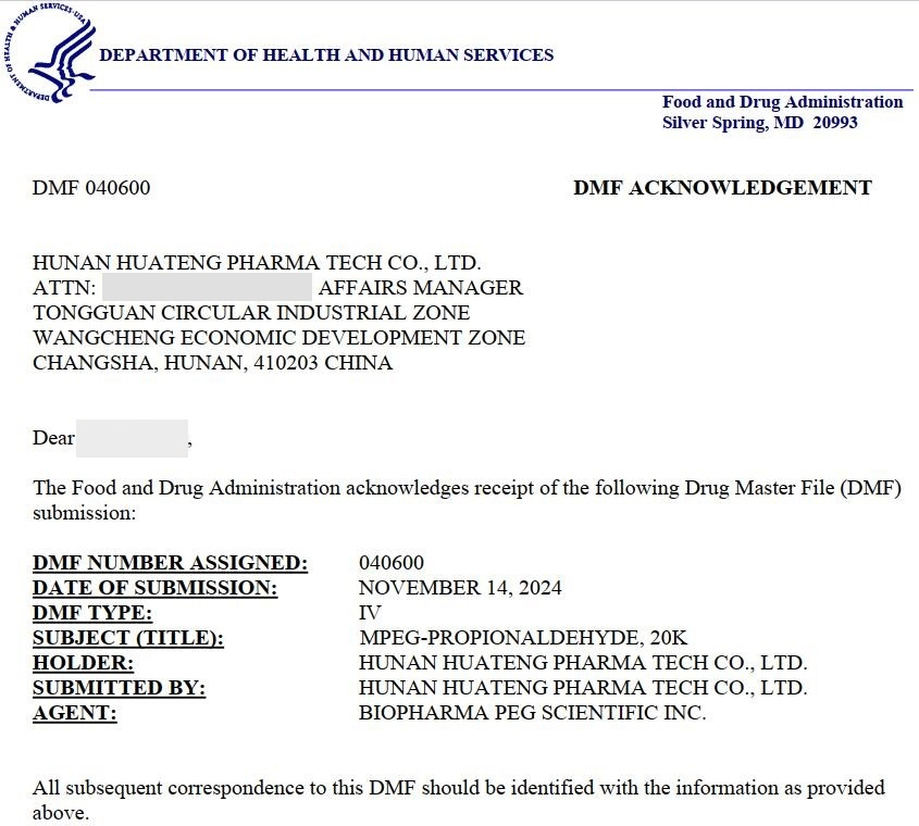 華騰制藥自主研發(fā)的mPEG-pALD(20K)產(chǎn)品成功獲得美國(guó)食品藥品監(jiān)督管理局(FDA)的藥品主文件(DMF)批準(zhǔn)(DMF編號(hào):040600)?!?